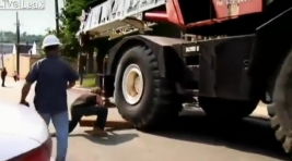 Neapskaužama situācija: milzu krānam slīpumā atsaka bremzes. Būvē strādājošie metas palīgā, liekot zem riteņiem dažādus priekšmetus, taču - vai tas palīdzēs?