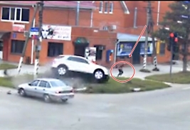 Pats vainīgs, pats arī cieš - novērošanas kameras fiksē avāriju, kas notiek tādēļ, ka krosovers iebrauc krustojumā pie luksofora sarkanā signāla. Džips uzmet kūleni, taču izskatās, ka viss beidzas salīdzinoši veiksmīgi, tostarp arī meitenei, kuru paglābj ātra reakcija un veiklas kājas.