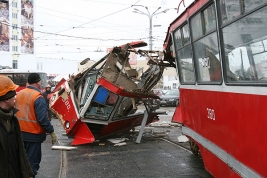 Autobuss pārdala tramvaju uz pusēm.
