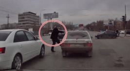 Šķiet, ka gājējam slikts garastāvoklis, tādēļ viņš sarīko kautiņu ar autovadītāju, kurš apstājies mazliet par tālu.