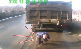 Liktenis ir labvēlīgs kādam šoferim, kurš palien zem automašīnas izlabot bremzes - kad spēkrats negaidot sāk slīdēt atpakaļ (skatīt no 0:40), viņam izdodas paglābties no nāves.