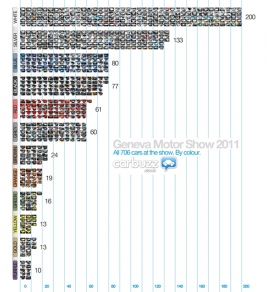 Britu izdevums Carbuzz publicējis interesantu novērojumu – no 706 Ženēvas autoizstādes eksponātiem, divi simti ir krāsoti baltā krāsā, kas nozīmē, ka šī krāsa pašlaik ir populārākā.