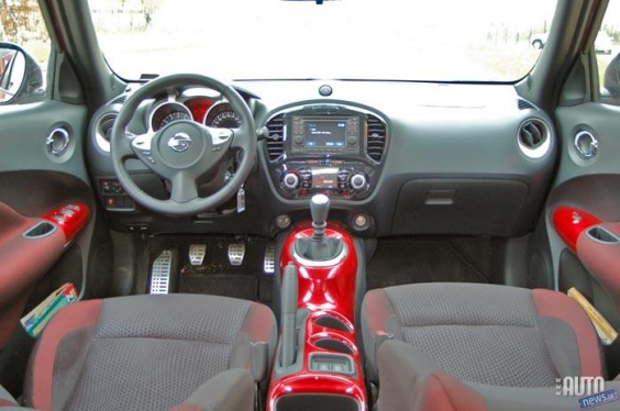 Neraugoties uz to, "Juke" salonā ir lielāka šaurība, nekā "Urban Cruiser" salonā, galvenokārt tāpēc, ka jumta līnija aizmugurē ir krietni slīpāka, sajūtas iekšpusē ir krietni priecīgākas. "Nissan" ir kārtīgi pastrādājuši, lai padarītu Juke sportisku, un par to liecina arī interjers, kura izveidē par iedvesmu kalpojuši ... motocikli. Šofera darba vieta nudien izskatās ļoti interesanti. Salona viduskonsole ir metāliska un krāsota virsbūves krāsā, tā gandrīz vai atgādina motocikla bāku, bet uz tās augstu novietotais ātrumkloķis ir tik parocīgs, ka rada gandrīz vai rallija mašīnas sajūtu. Vēl mazliet, un būtu sacīkšu pilota kokpits! Arī reljefi izbīdītie spidometra un tahometra apļi ar virspusē novietoto jumtiņu iederētos kāda stilīga motocikla dizainā. Apdares materiāli nav dārgi, taču tie iederas kopējā noformējumā un liekus komentārus neprasa. Stūresrats paņemts no Infiniti, bet stūres kolonna regulējas tikai augstumā.