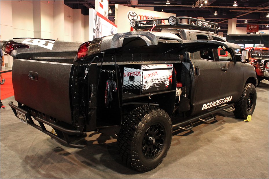 Toyota Tundra Motorcross Truck. Vieni uz leju, citi uz augšu - "Toyota Tundra Motorcross Truck " no "West Coast Customs", izmantojot speciālas atsperes un amortizatorus, pacelts uz augšu un piemērots bezceļu pārvarēšanai. Tā arī jābūt, jo motokross taču pilsētas centrā netiek rīkots. Toyota pikapam ir uzstādīta vinča, kas palīdzēs iedabūt sacīkšu tehniku kravas kastē un kāda īpaša ekstra – zem aizmugures spārniem iebūvētas novietnes instrumentiem ar augsta spiediena mazgāšanas iekārtu komplektā.