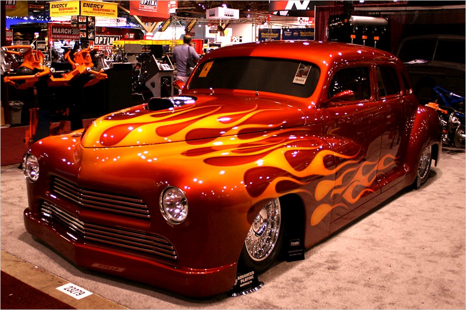 Custom Car. Būtu naivi iedomāties, ka ar šo uz vēdera noguldīto " Custom Car " var kaut kur aizbraukt. Tas domāts vienīgi izstāžu zālēm, toties priecē ar šim pārbūves stilam raksturīgo liesmu dizainu.