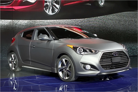 Hyundai Veloster Turbo. Līdz šim korejiešu sportiskā kupeja bija pieejama ar visai necilu 140 ZS benzīna motoru, taču uz Detroitu Hyundai atvedis krietni agresīvāku modifikāciju – Veloster Turbo, kurai iebūvēts 210 ZS turbo agregāts.