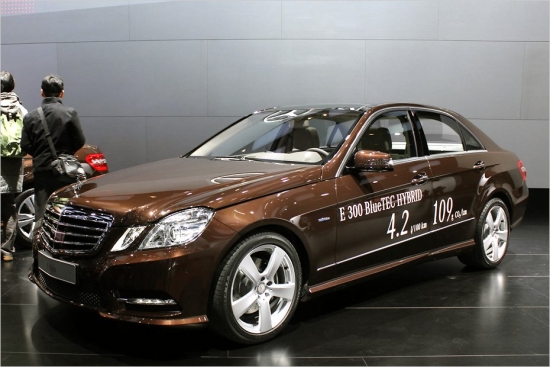 Mercedes E 300 BlueTec Hybrid. Uz Detroitu Mercedes atvedis divus E klases hibrīdus: Mercedes E 300 BlueTec Hybrid un E 300 BlueTec Hybrid. Pirmais no tiem aprīkots ar četru cilindru 204 ZS dīzeli un 27 ZS e-motoru, kas palīdzēs samazināt degvielas patēriņu līdz 4,2 l/100 km, kas ir par 0,7 l/100 km mazāk nekā 250 CDI ar analogu dīzeļmotoru. Mazliet kuriozs fakts: lai gan automašīnas debija notika Detroitā, ASV pircējiem to neredzēt, jo Mercedes E 300 BlueTec Hybrid paredzēts vienīgi Eiropai.