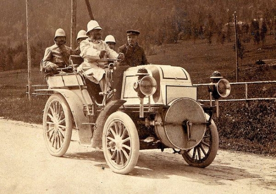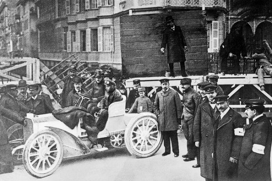Foto. Interesants kadrs. Gadu pēc triumfālās uzvaras Nicas Auto nedēļā, Emīls Jelineks izgāja uz starta ar daudzsološā konstruktora Ferdinada Poršes izstrādāto Lohner-Porsche benzīna-elektrisko hibrīdu.
