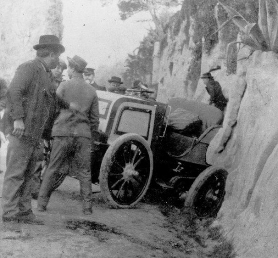 Foto. Traģēdija Nicas 1900.gada Nicas nedēļā. Vilhelms Bauers avarē jau pirmajā pagriezienā. Nedaudz vēlāk, braucējs mirst slimnīcā.