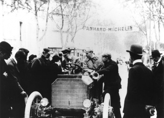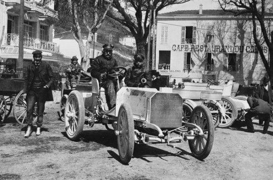 Foto. Vernera-Brauna ekipāža 1901.gada Nicas Auto nedēļas izturības sacīkšu finišā.