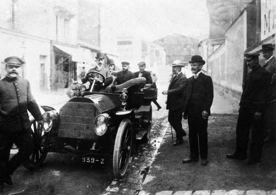 Foto. Jelineks (aizmugures plānā) pie Daimler Motoren Gesellshaft franču aģenta ēkas. Attēls uzņemts aptuveni 1903.-1904.gadā, kad Emīla attiecības ar kompānijas vadību sāka strauji pasliktināties.